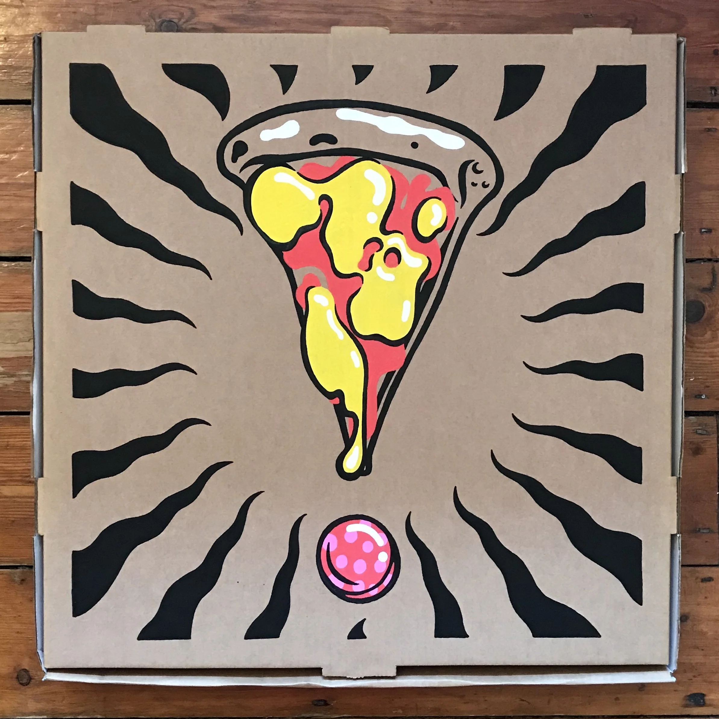 National Pizza Day, Pizza Exclamation 22" box. Created in Adobe Illustrator with a Wacom Cintiq, then hand painted with Posca Pens & acrylic.