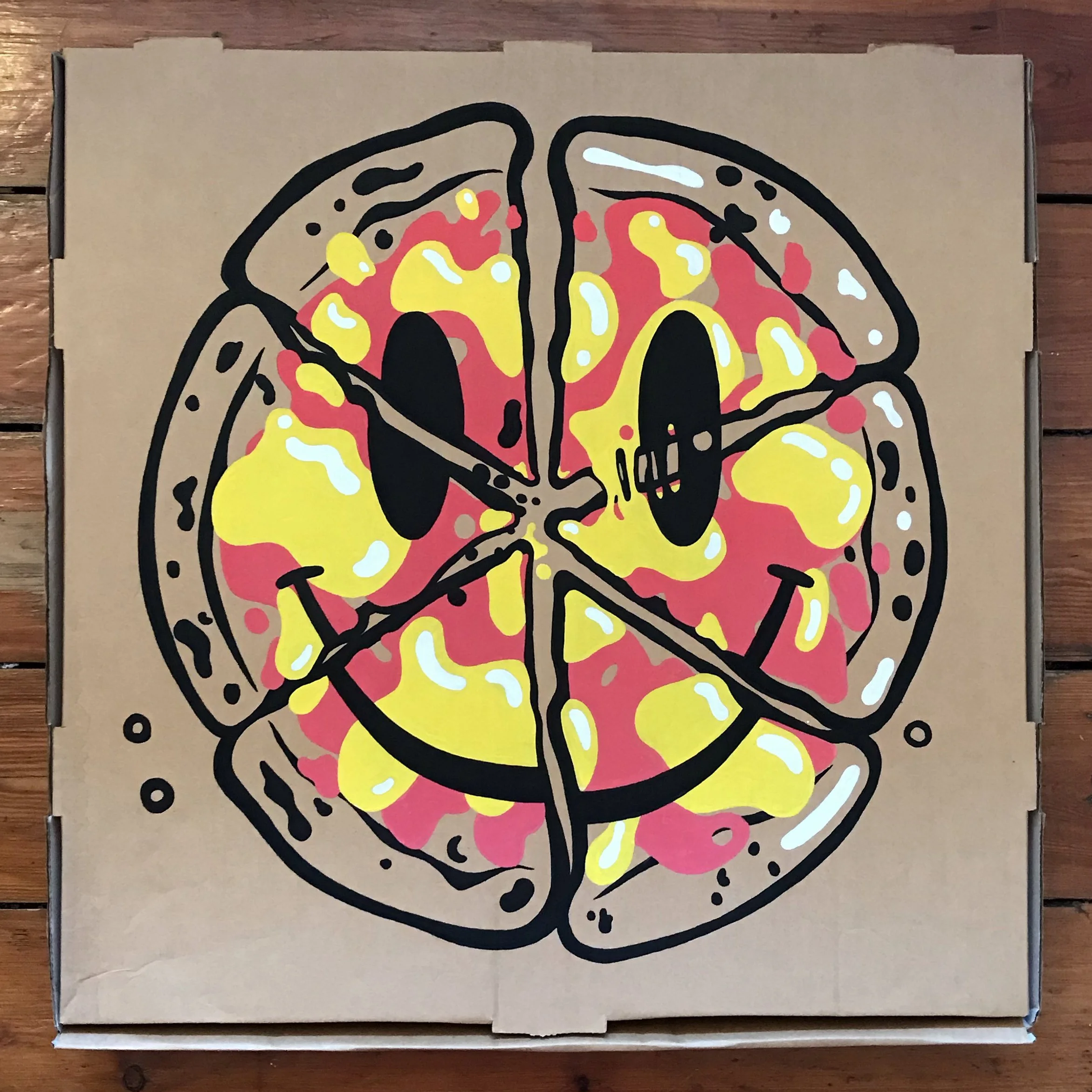 National Pizza Day, Pizza Smiley 22" box. Created in Adobe Illustrator with a Wacom Cintiq, then hand painted with Posca Pens & acrylic.